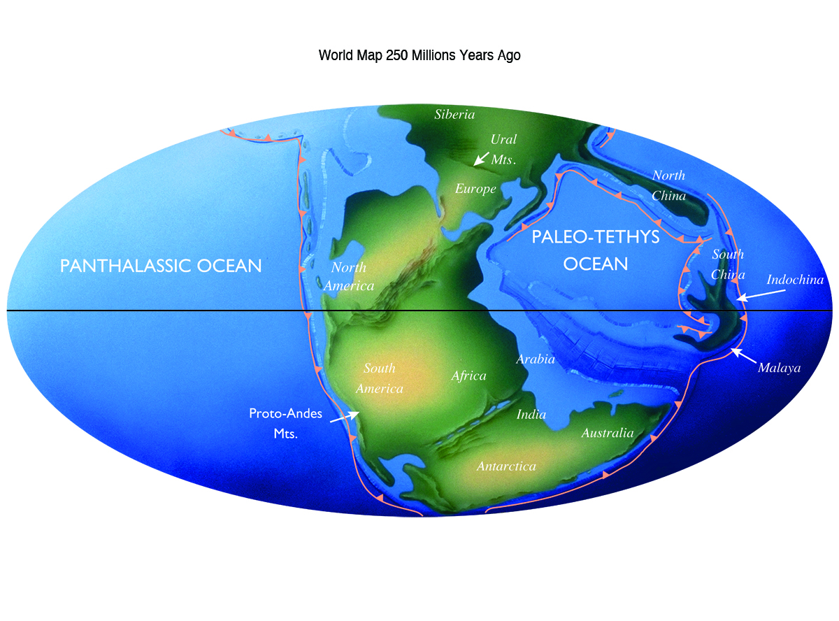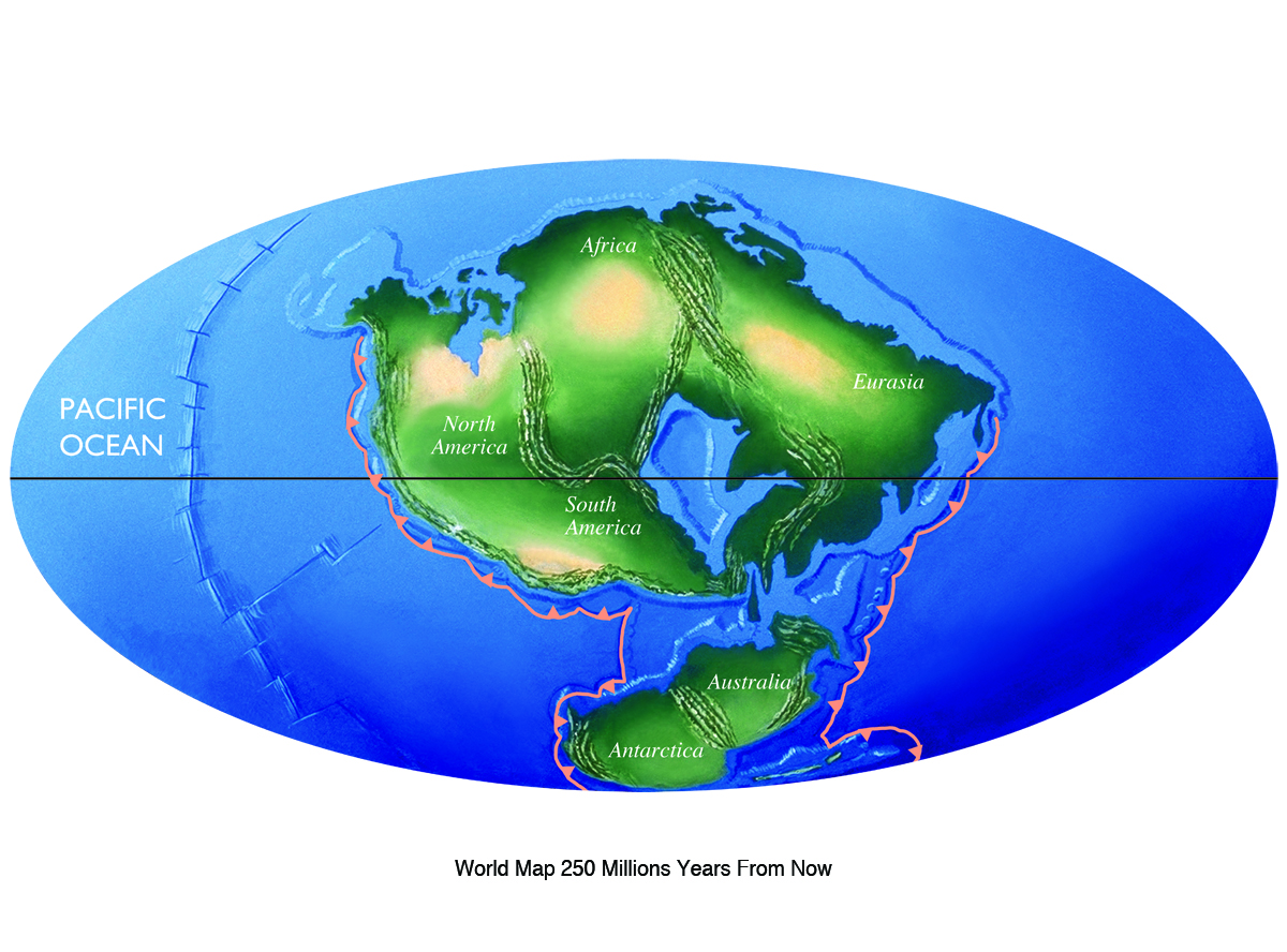 250 millions years ago, the Earth's continents were fused into a single landmass called Pangaea. Contemporary geological evidence and continental plate motions predict that over the course of the next 250 million years, Australia will collide with Southeast Asia and China, California will slide northwards and Africa will collide with Southern Europe, closing the Mediterranean - thus resulting in the return of Pangaea. World Map consists of two posters, placed on top of each other, showing this development. sources: Nasa, Wikipedia, Paleomap project (www.scotese.com) |